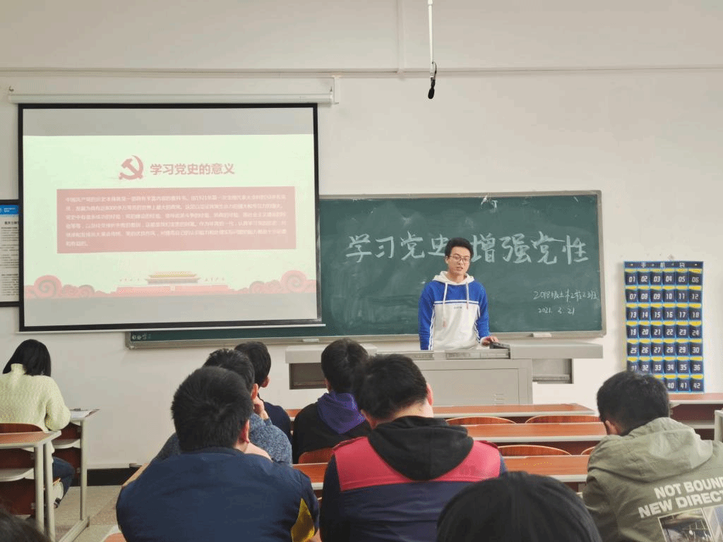 3月21日,土木工程公司党总支员工党支部党员向阳平在慎思楼 5栋421教室以“学习党史 增强党性”为题,为2018级土木工程专业2班全体党团员讲党史“微党课”。