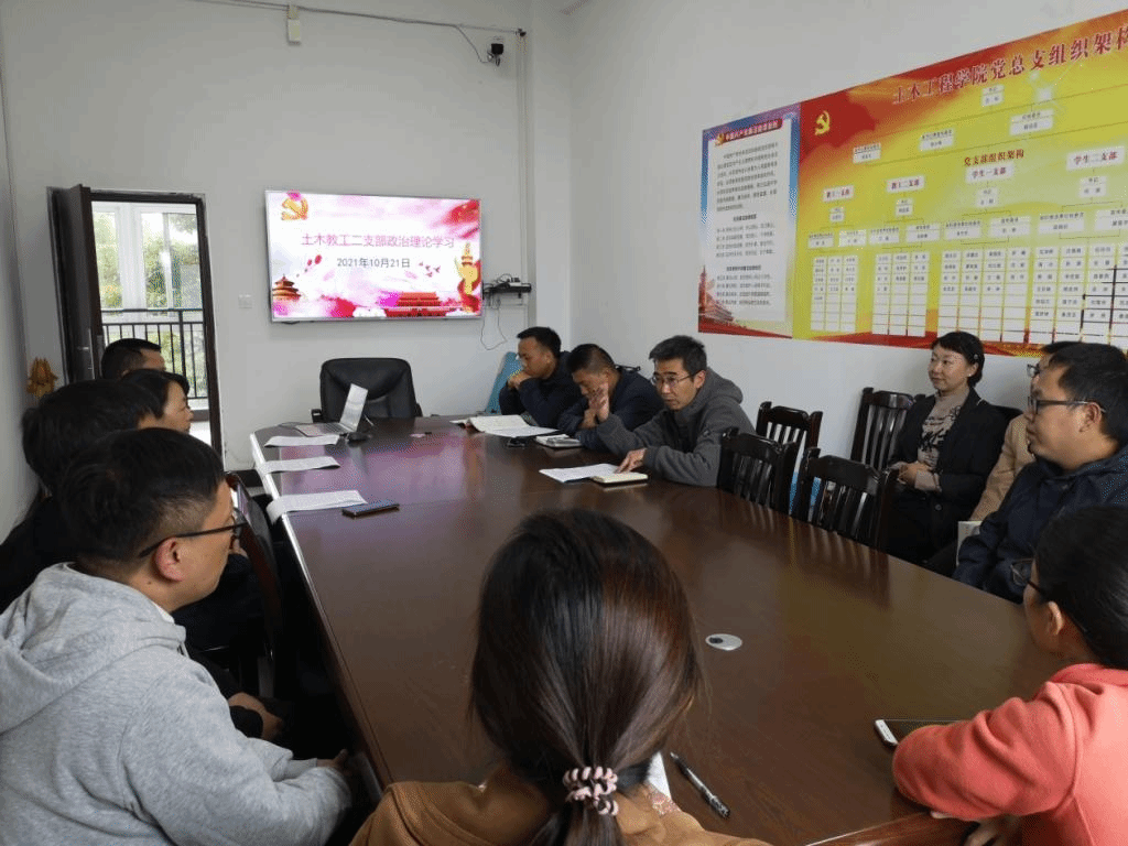 10月21日下午,土木工程公司党总支教工第二党支部全体党员在慎思楼5栋401开展集中政治学习,学习活动由党支部书记周廷强主持。