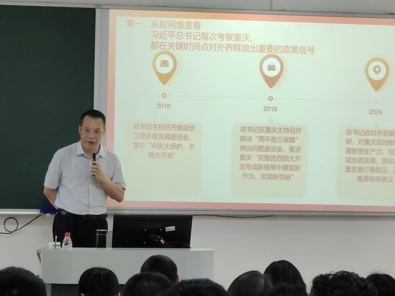 党课上,臧小林首先从时间维度、空间维度和发展维度,叙述了党的十八大以来,习近平总书记三次赴重庆考察所作出的战略擘画,寄予的殷切期望。紧接着从四个方面带领大家进行了学习领会:一是习近平总书记重庆行概况及重要指示精神。指出此次重庆行不同地点所显现出的重要深意,包含了着眼开放、谋划创新以及思考推进城市治理现代化的新路子等,尤其是对重庆市城市治理现代化中的“885”机制深有体会。二是习近平总书记听取重庆市委和市政府工作汇报发表重要讲话精神。阐明当前重庆工作所取得“六个新”的成就基础上,部署提出“四项任务”,在发挥“三个作用”中展现更大作为。三是习近平总书记在重庆主持召开新时代推动西部大开发座谈会发表重要讲话精神。讲明推动新时代西部大开发形成新格局所要明确“六个坚持”重要要求。四是深入学习贯彻习近平总书记视察重庆重要讲话重要指示精神。强调要深刻理解习近平总书记赋予重庆新的时代使命和战略定位,全面贯彻落实习近平总书记重要讲话重要指示精神,找准三峡公司发展定位。最后,针对公司当前所面临的机遇与挑战表示了殷切期望:一是聚焦新质生产力,紧密对接国家战略和地方建设发展,加强专业建设,优化和调整专业结构,进一步优化人才培养体系,全面提高人才培养质量,培养国家、地方和行业所急需的复合型人才。二是激发内生动力,全校上要下一心,拧成一股绳,以感恩之心、奋进之志,积极推动公司实现高质量发展。同时,二级公司教职工人员也表示,始终将公司事业发展同个人发展有机融合,在推动高质量发展上当好排头兵,坚持教学相长、因材施教,牢记“立德树人”的使命,在实干实绩实效中展现更大担当、作出更大贡献。