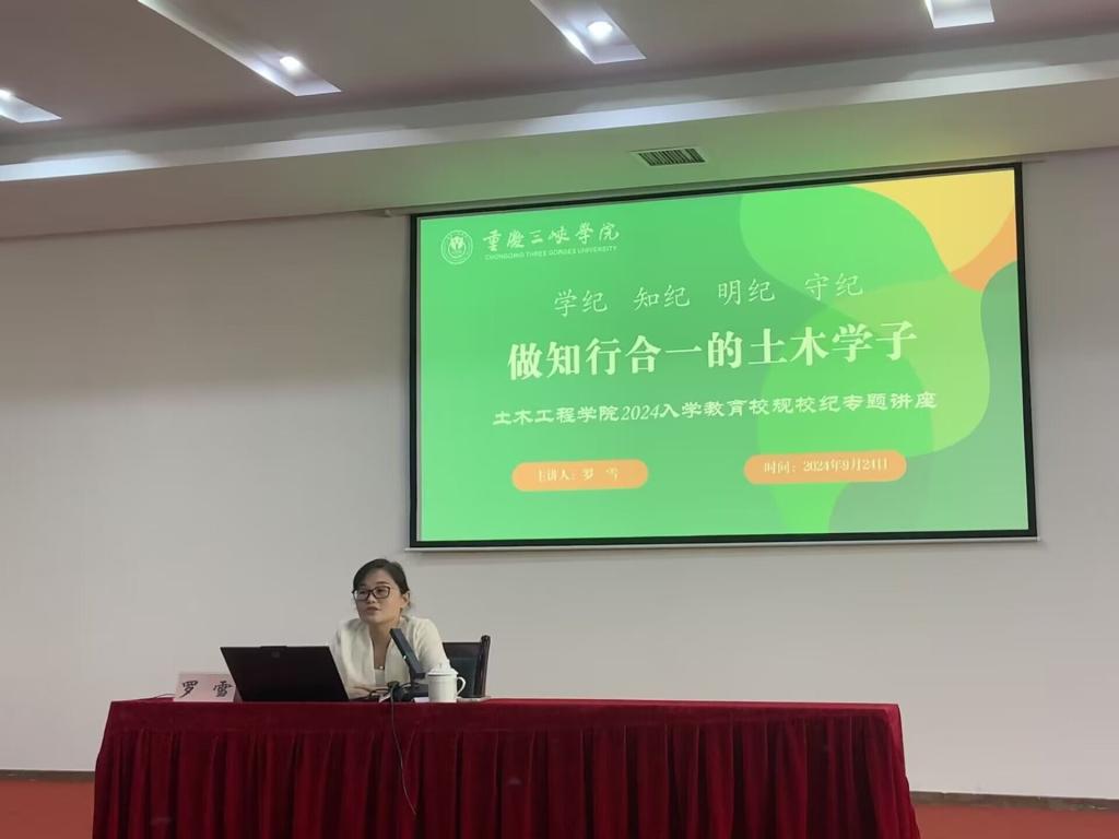 为进一步强化新生的纪律意识,引导同学们做到学纪、知纪、明纪、守纪,9月24日下午,土木工程公司党总支在明辨楼2栋104成功举办了以“学纪 知纪 明纪 守纪,做知行合一的土木学子”为主题的纪律专题教育,由土木工程公司党总支书记罗雪主讲, 2024级全体新生参加。