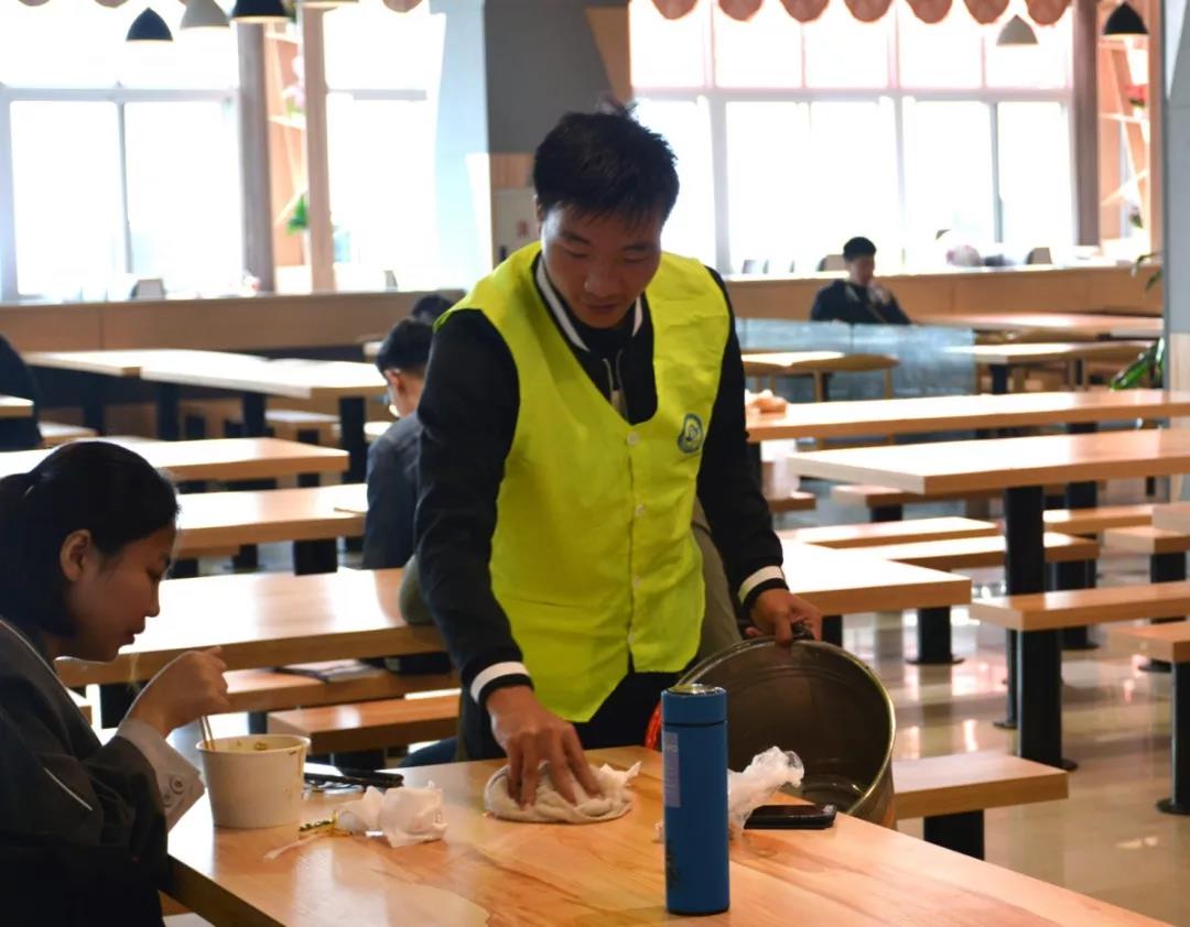 随后,志愿者们义务帮助食堂阿姨清理员工就餐完毕后的食物残渣,打扫食堂卫生。