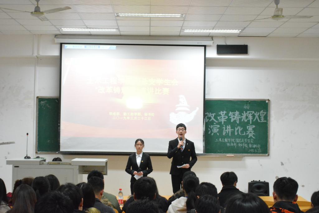 比赛现场光影闪烁,熠熠生辉,随着参赛选手和观众的陆续进场,在主持人的引导下,选手们按顺序上台演讲,台上选手演讲风格各异,既有慷慨可纳四方之志,亦有舒缓动情手可摘星,引起在座观众的强烈震撼和共鸣,博得了现场观众的阵阵掌声。选手们演讲角度也非常多样化,有的从自身生活环境出发,有的从关键事件为点,有的以成长轨迹为线,以小见大,娓娓讲述自己与改革开放的故事。他们以饱满的热情,昂扬的精神状态,满腔热忱给在场听众带来一次又一次精神上的洗礼;一篇又一篇发自内心的深情演讲使人受益匪浅,帮助同学们更加了解改革开放的成功与伟大。洪鹏老师对本次比赛进行了点评,既总结了各位选手的优点,也指出了其中存在的问题,同时详细地讲解了两个一百年奋斗目标的具体内容,希望同学们积极参与到祖国的建设中去。