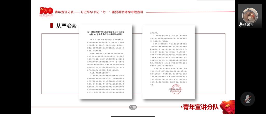 此次线上交流会由团总支员工副书记张馨月主持召开。首先,张馨月向全体成员讲述了习近平总书记“七一”重要讲话的实质内容,并强调了此次讲话的意义。结合讲话要点,详细重点解读“四个庄严宣告”和“九个必须”。并且结合实事和数据分析“六个贯通”讲话精神内涵,将强国梦和青年紧密相连。最后通过反面案例明确提出员工会深化改革要求——即从严治会,把改革意见和学会制度密切融合,为各成员在今后的学习与工作提供了明确的方向标。