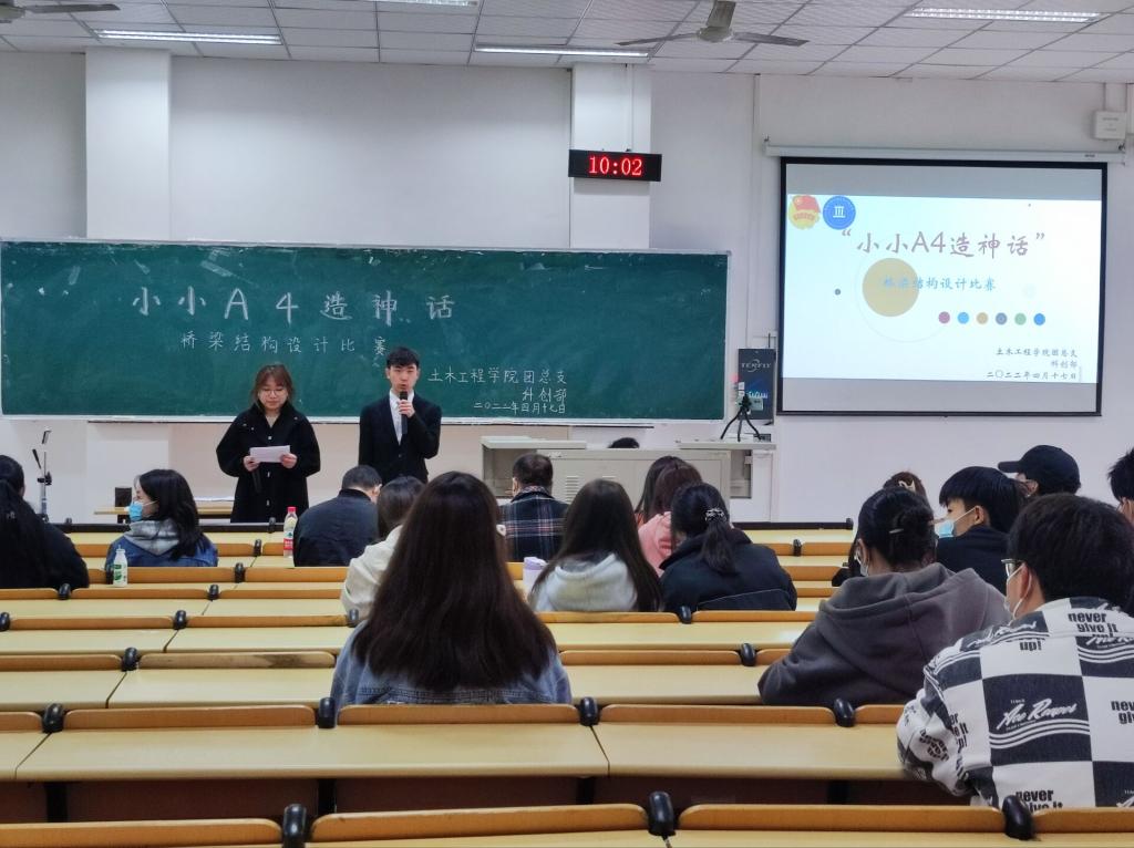 4月17日,由beat365科创部举办的“小小A4造神话”桥梁结构设计比赛在明辨楼二栋206拉开帷幕。公司教师熊礼全、姜开渝、研究生谷易、主席团成员罗艺萱担任本次比赛评委。