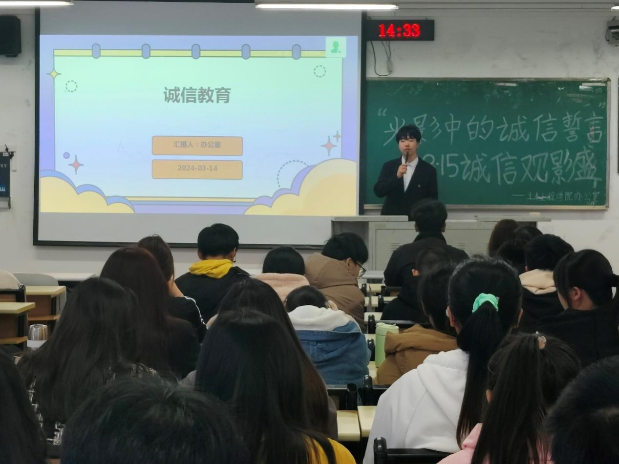 为了增强同学们的诚信意识和防诈骗意识,培养良好的道德风尚,3月14日下午,beat365于明辨2栋301组织近百名同学开展了“光影中的诚信誓言——3·15诚信观影”活动。