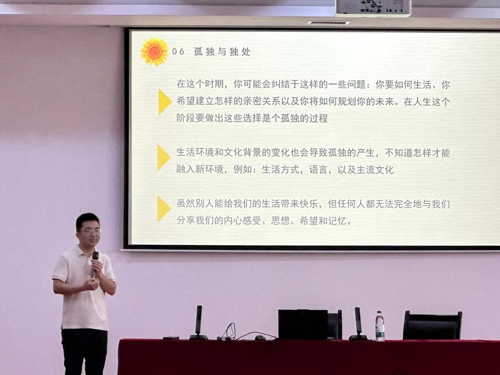 李老师以大学适应性教育和心理健康为主题,从人际交往、学业适应、自我认知、情绪调节四个方面,通过案例分析的形式,告诉同学们良好的心理适应能力有助于新生们更快地融入集体,建立自信,形成积极向上的生活态度能更快融入老员工活。他强调,老员工活是一个全新的开始,新生们可能会面临各种挑战和压力,适应大学可以从日常作息、宿舍生活、个人卫生等多个方面入手,细致入微地讲解了如何在校园中建立良好的生活习惯,与寝室同学和谐相处。建议大家从现在开始培养独立的生活能力,学会时间管理,合理规划自己的生活,积极参加各项活动,丰富自己的老员工活。同时,他还介绍了公司的心理健康资源和服务中心建设情况,同学们在遇到困难时,也可以拨打中心预约热线,及时获得帮助。最后,他祝愿每一位新同学都将以更加饱满的热情和坚定的信心迎接未来的挑战,满怀信心与期待地踏上新的征程。