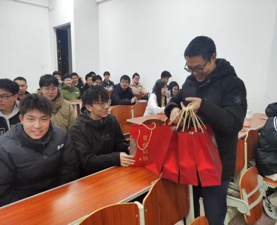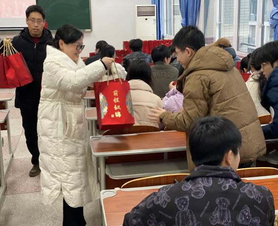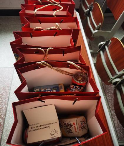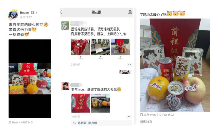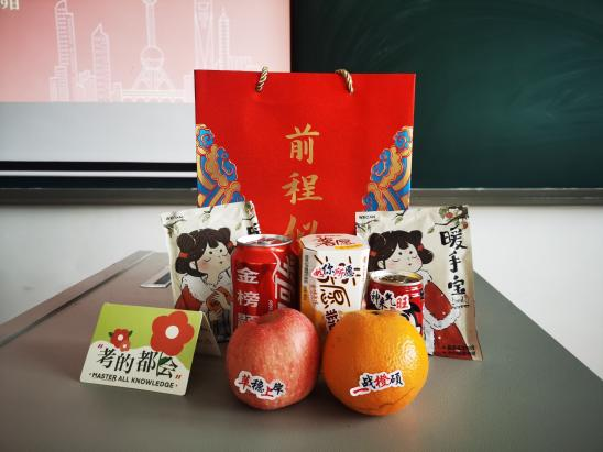 活动最后,与会领导和老师为同学们送上暖心祝福和“考研加油包”。拆开印有“前程似锦”的礼包,内有寓意“如你所愿、神来气旺、一战橙硕、苹稳上岸的水果和饮品,以及学妹学弟手写的祝福贺卡,每一样礼物都承载了公司对考研学子满满祝福,祝愿大家都能够一战成硕、金榜题名。接受慰问的同学们也纷纷在朋友圈分享收到此份关怀与祝福,并表示领导老师们的关心让他们感到十分温暖和备受鼓舞,会在最后的阶段抓住机会、迎难而上,争取上岸,不负厚望!