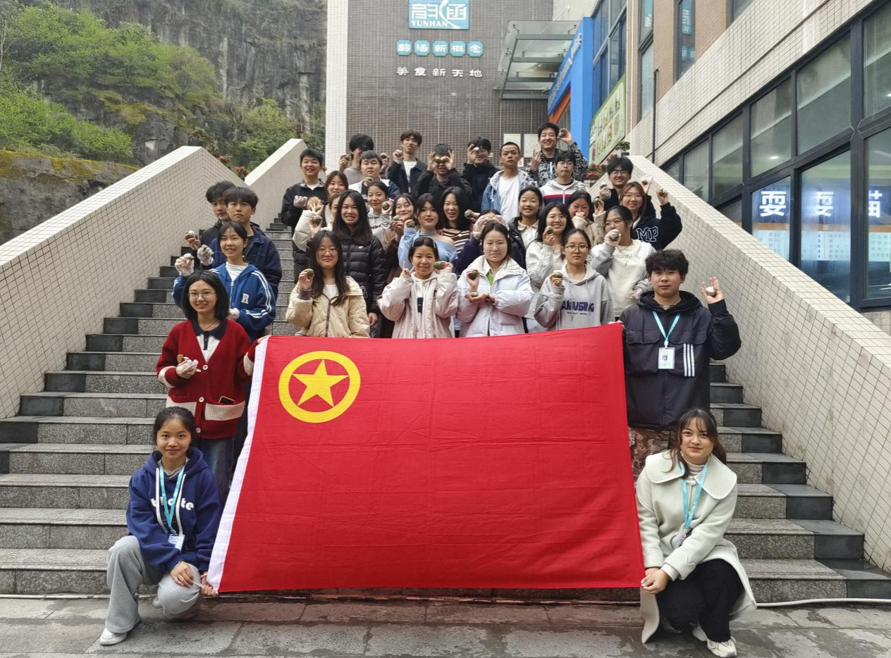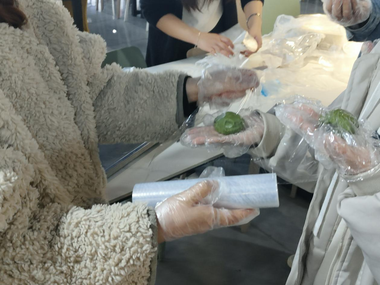 随后,同学们移步至蓝雾苑食堂一楼,参与包青团活动。同学们用糯米粉拌入艾草汁或其他绿色植物汁液揉成面团,再包裹豆沙、枣泥等馅料制成糕点。大家一边亲手揉面、包馅,交流制作技巧,制作出一个个象征着春天气息的青团。青团的制作不仅让同学们感受到传统美食的魅力,也增进了彼此之间的交流与合作。