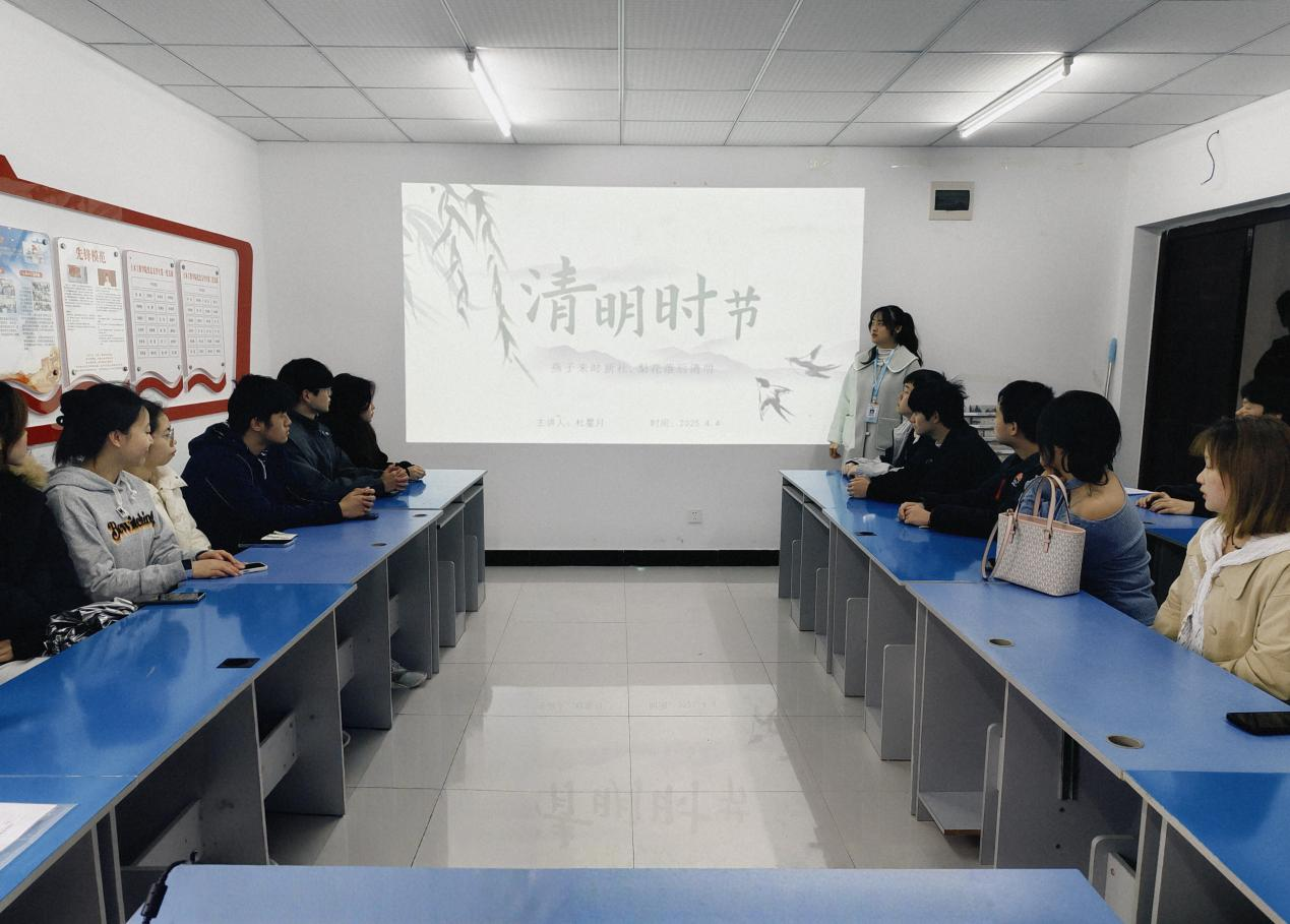 在蓝雾苑一舍党员活动室,活动主持人结合丰富的史料、生动的故事,讲解清明节与寒食节、上巳节的渊源,以及清明习俗如扫墓、踏青、插柳等的文化寓意,深入浅出地讲解清明节的起源、习俗演变以及其所承载的文化内涵,同学们亦认真聆听,积极互动。