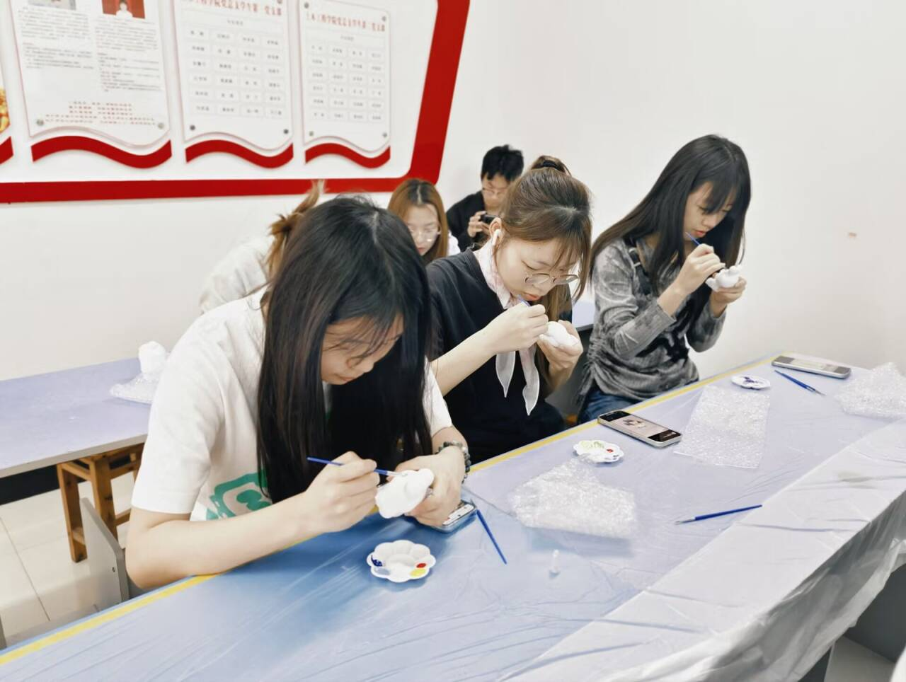 活动伊始,形态各异的石膏娃娃整齐摆放,憨态可掬的卡通形象、充满故事感的经典角色,现场便洋溢着浓厚的创作热情。同学们通过色彩随意搭配,细致勾勒人物细节,少数同学将表情包等流行元素融入作品,打造出个性十足的设计。现场不时传来讨论配色方案的交流声,同学们欢声笑语,形成独特的协作氛围。