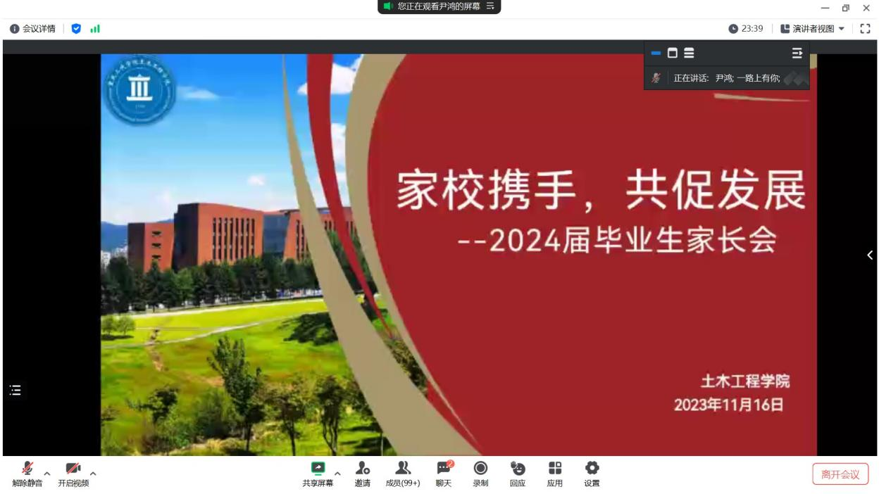 为进一步做好2024届毕业生就业工作,凝聚家校育人共识,形成就业合力,扎实推动2024届毕业生更充分更高质量就业,11月16日晚,beat365于线上召开“家校携手,共促发展”2024届毕业生家长会暨就业动员会议。会议由公司2024届毕业生辅导员尹鸿主持,全体毕业生家长参会。