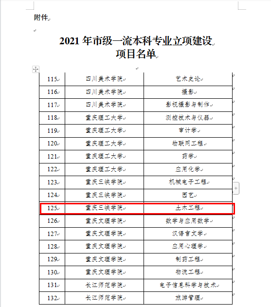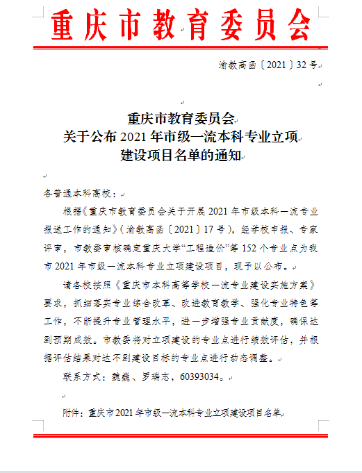 日前,重庆市教育委员会下发了“关于公布2021年市级一流本科专业立项建设项目名单的通知”,公司土木工程专业成功获批重庆市一流本科专业。