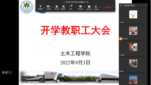 9月3日下午,土木工程学院通过企业微信线上召开了2022年秋季学期开学教职工大会,会议由公司党总支书记罗雪主持。