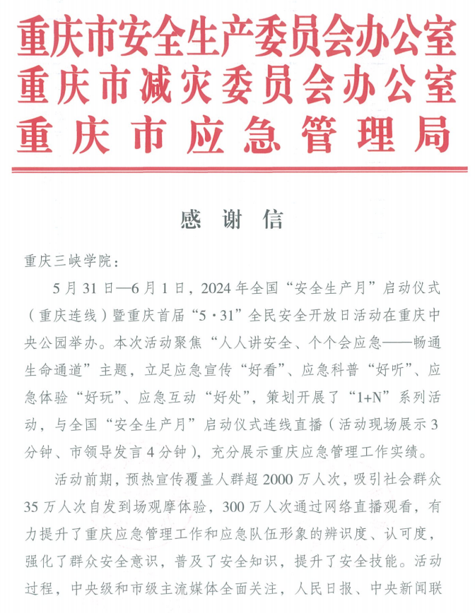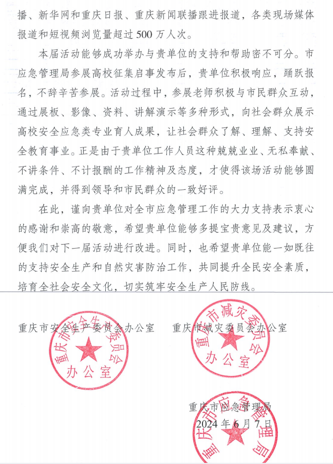 近日,公司收到重庆市安全生产委员会办公室、重庆市减灾委员会办公室、重庆市应急管理局发来的感谢信,对公司在参加首届2024年全国“安全生产月”启动仪式(重庆连线)暨重庆首届“5·31”全民安全开放日活动中向社会群众展示高校安全应急类专业育人成果,让社会群众了解、理解、支持安全教育事业表示衷心的感谢和崇高的敬意。