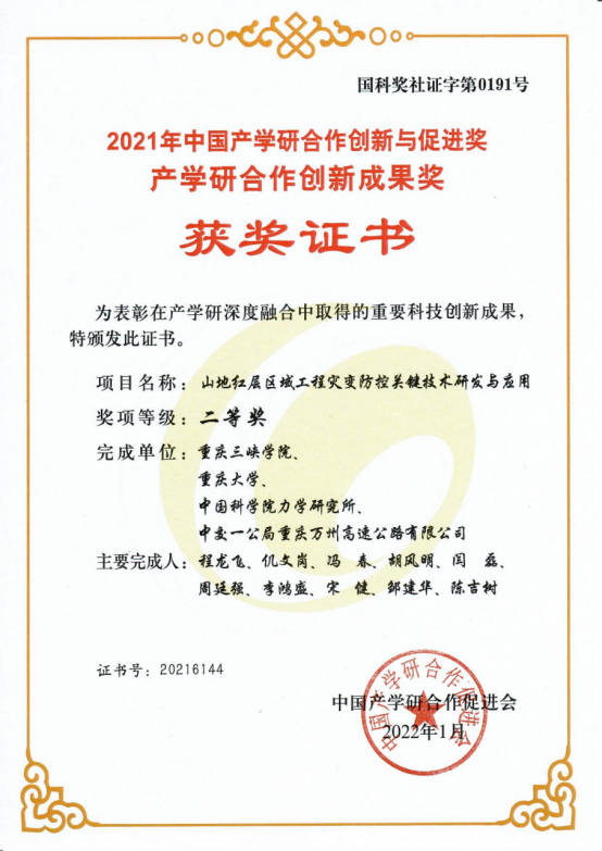 公司程龙飞教授团队申报的“山地红层区域工程灾变防控关键技术研发与应用”获得中国产学研合作创新成果奖二等奖。