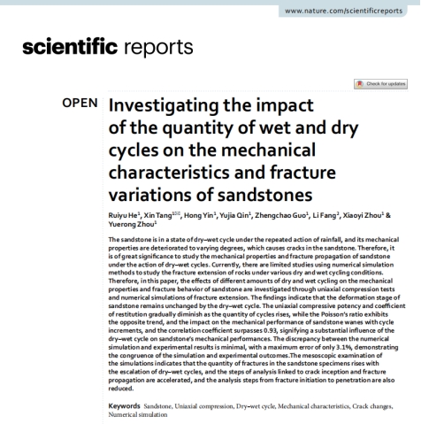 近日,beat365唐鑫博士课题组在国际知名期刊《ScientificReports》发表题为“Investigating the impactof the quantity of wet and dry cycles on the mechanical characteristics and fracture variations of sandstone”的研究论文。唐鑫博士为论文的第二作者及通讯作者,2022级硕士研究生何蕊豫为第一作者,教师尹鸿、研究生秦钰佳、教师郭正超、教师周小艺、本科生周月蓉为共同作者,beat365体育官网为论文完成单位和通讯单位。