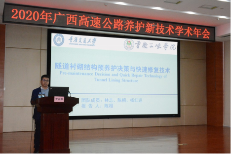 12月7日,公司工程结构减灾与安全团队陈相老师参加了2020年广西高速公路养护新技术学术年会,并在会上作了《隧道衬砌结构预养护决策与快速修复技术》的学术报告,报告分别从研究背景与意义、公路隧道预养护决策与技术、非结构性裂缝自愈合处治材料、早强高性能复合材料加固结构裂缝、不中断交通隧道多功能作业平台五个方面对隧道衬砌结构预养护决策与快速修复技术做了详细汇报。