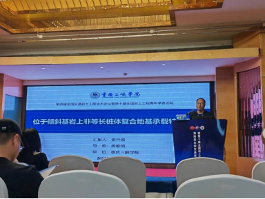 姜开渝老师在会上做了题目为“位于倾斜基岩上非等长桩体复合地基承载特性研究”的汇报,针对位于倾斜基岩上竖向受荷的非等长桩体复合地基为研究对象,将桩-土体系分解为垫层、扩展土和虚拟桩三部分,分别建立扩展土和虚拟桩的竖向应变表达式,结合虚拟桩与扩展土在相应位置处的应变协调条件得到关于虚拟桩轴力的第二类Fredholm积分方程,通过将该积分方程转变为一扩展的代数方程,并引入迭代算法进行数值求解,最终结合案例开展了影响因素对其竖向承载特性的敏感性分析。