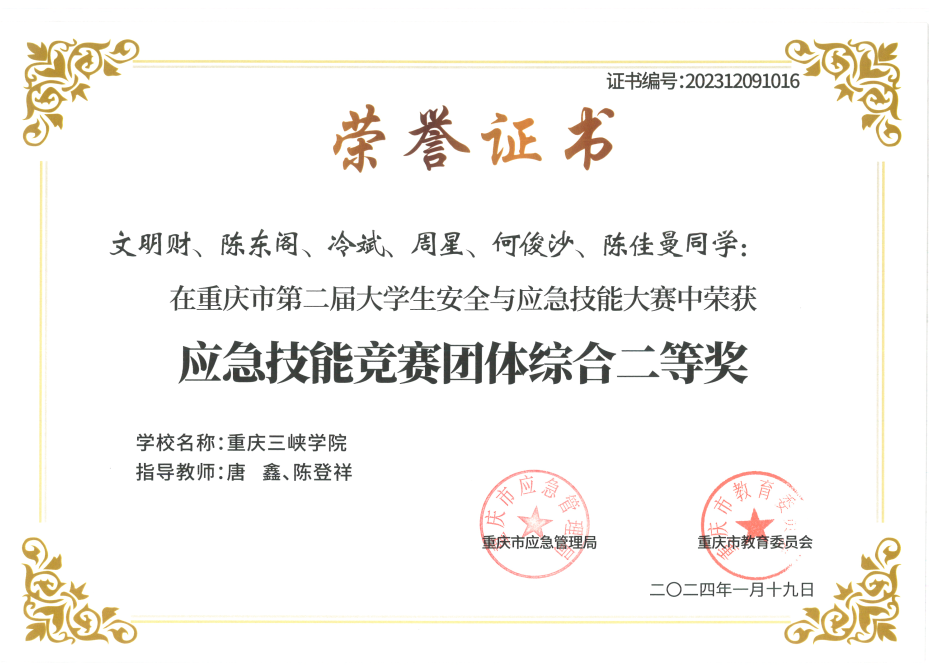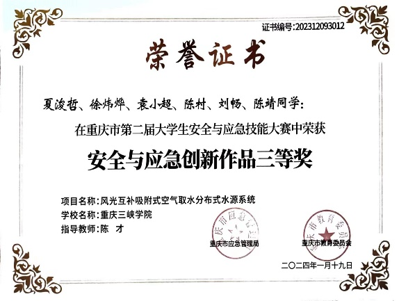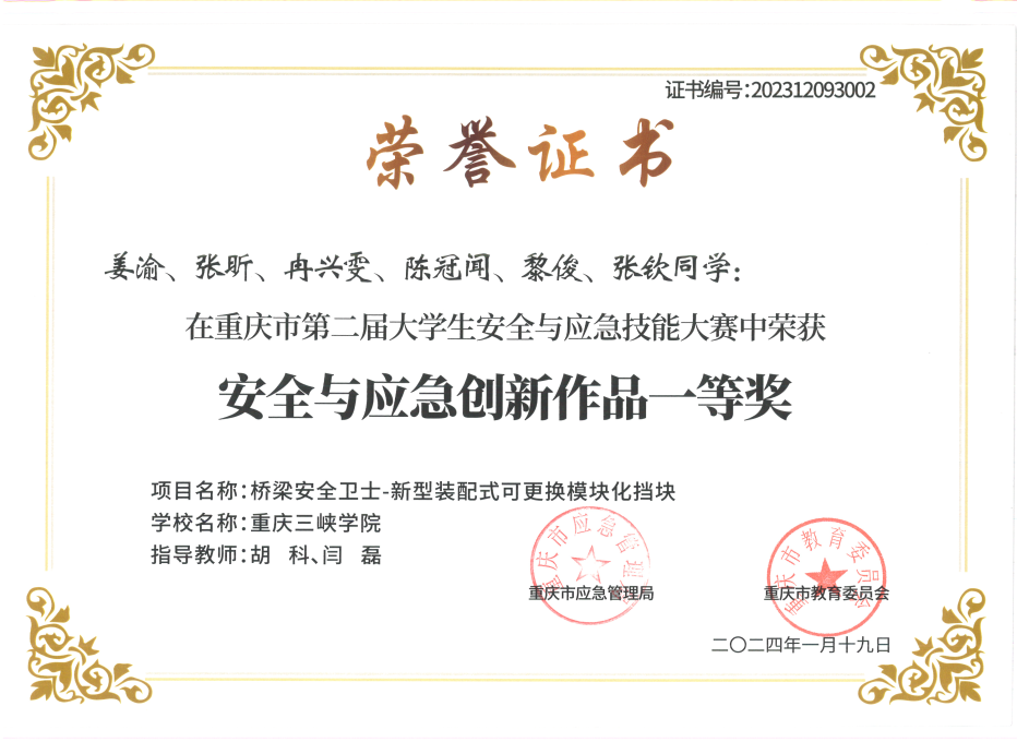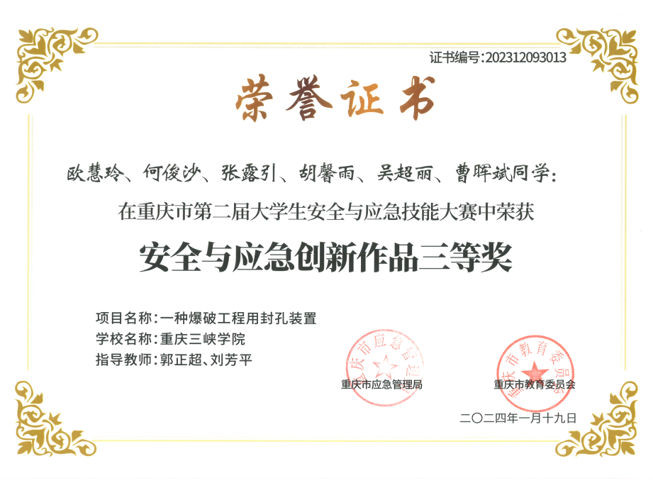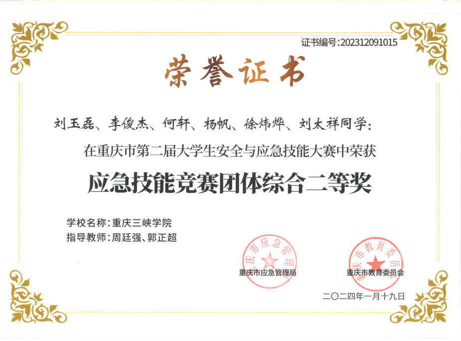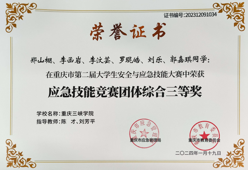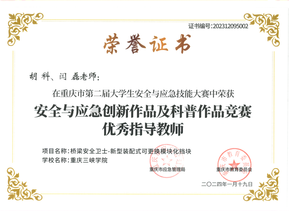 近日,重庆市应急管理局、重庆市教育委员会通报了关于重庆市第二届老员工安全与应急技能大赛获奖情况,公司beat365学子共获得6项奖励(一等奖1项,二等奖2项,三等奖3项),胡科、闫磊获得优秀指导教师。