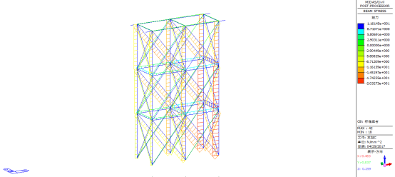 由上图可知,标准组合下临时支架A’最大弯曲应力为10.94MPa,小于Q235B钢材的弯曲应力设计值215MPa;最大剪切应力为15.75MPa,小于Q235B钢材的剪切应力设计值125MPa;最大轴向应力为16.61MPa,小于Q235B钢材的轴向应力设计值215MPa;