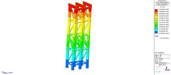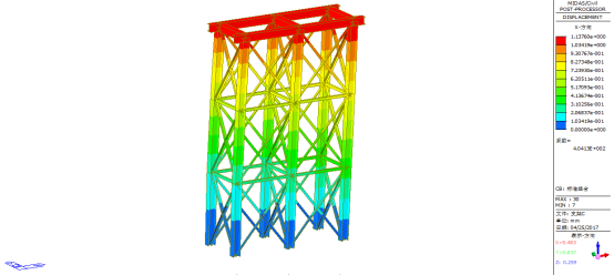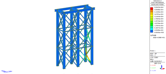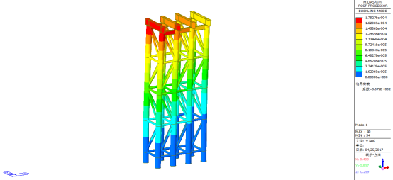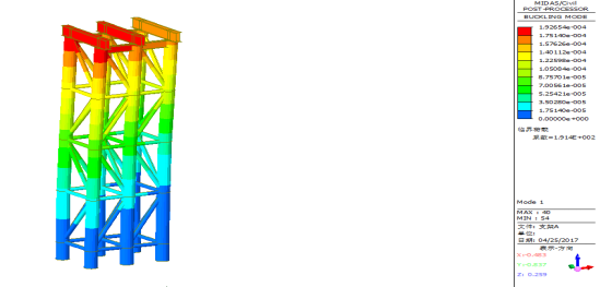 由上图可知,支架A’在顶部作用力下一阶屈曲稳定系数为307.2,大于经验系数4.0,因此临时支架A’整体稳定性满足要求。