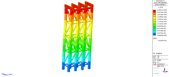 由上图可知,标准组合下施工支架A’最大竖向位移为-0.76mm,最大纵向位移为2.23mm,最大横向位移为0.22mm;因此临时支架A’刚度有足够的刚度。