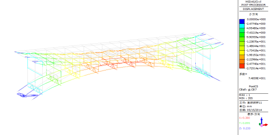 全桥最大竖向位移为-2.37cm,主拱肋最大竖向位移为-2.33cm,均小于L/600,刚度满足要求;