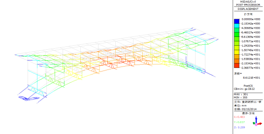 建模采用midas/civil2012有限元分析软件,按设计材料类型和截面尺寸建模分析弹性阶段最不利荷载工况下成桥阶段及施工阶段的受力性能;拱肋采用组合截面中的一般截面,梁单元建模,拱肋横撑、立柱及盖梁均采用梁单元建模,桥面板通过虚拟横梁等效为梁格体系,桥面板两端按简支梁体系连接;由于拱脚坐落在原桥基础上,可认为地基状况良好,拱脚均采用墩底固结形式;成桥阶段共划分为421个节点,601个单元,全桥离散图如下所示: