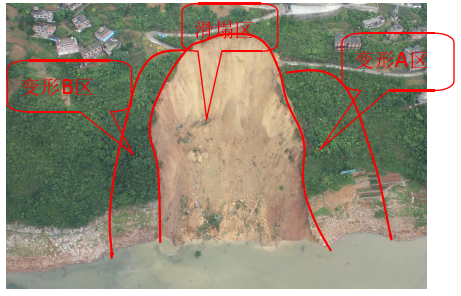 随着中后部裂缝变形急剧扩张-贯通,中前部发生松脱式滑塌,滑坡于2015年6月25日18:25左右沿中后部裂缝发生整体滑移,中后部裂缝随滑体的整体滑移而消失。根据现场情况,将红岩子滑坡分为滑塌区、变形A区、变形B区3部分(图3)。