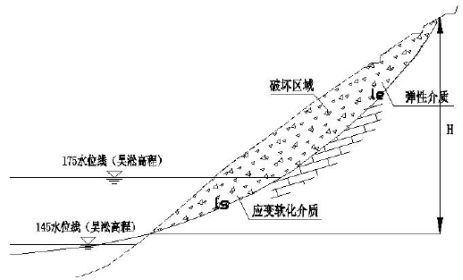 根据滑坡破坏后地质剖面,构建其力学模型,滑动面可分为175 m水位线以上部分和145 m 到175 m水位变动带间部分,分别为弹性介质和应变软化介质。