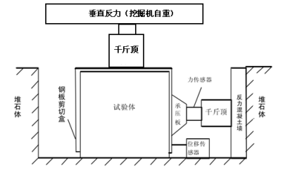 碾压土石体大型直接剪切试验原理与常规直剪试验相同,但剪力盒只设置一个上盒,下盒为护岸碾压土石体。碾压土石体大型直接剪切试验原理如图所示,试验的垂向压力由液压千斤顶在油泵作用下提供,同时水平推力也由液压千斤顶在油泵作用下提供,对碾压土石体施加剪切力。施加力的大小由压力表读取,位移由电子百分表读取。