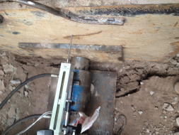 3、法向系统安装:在试体顶部铺一层细砂并找平,使试块顶面与预定剪切面平行,然后放上钢垫板,在其上依次安放滚轴排、垫板、千斤顶、传力筒、顶部钢垫板等。整个法向系统垂直于剪切面,确保法向合力通过剪切面中心。法向方向安装大量程百分表以测定试体的法向变形。(注:法向反力由挖掘机提供)。