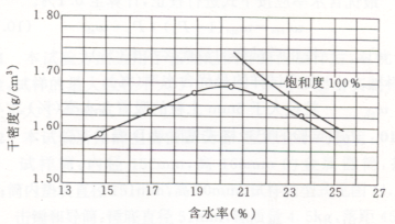 2.以干密度为纵坐标,含水率为横坐标,绘制干密度与含水率的关系曲线,曲线上峰值点的纵、横坐标分别为最大干密度和最佳含水率。如果曲线不能绘出明显的峰值点,应进行补点或重做。