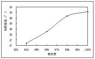 图9 密实度与内摩擦角关系(最大粒径5mm,碎石含量30%,含水率8.5%)
