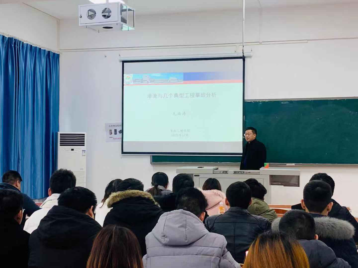 12月15日下午,beat365毛海涛教授做了题为“渗流与几个典型案例工程事故分析”的学术报告,公司土木水利全体研究生参加了此次学术报告。