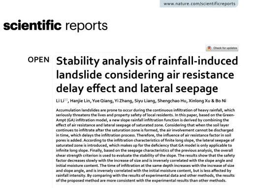 近日,公司强跃教授团队在国际知名期刊《Scientific reports》发表题为“Stability analysis of rainfall-induced landslide considering air resistance delay effect and lateral seepage”的研究论文。李莉副教授为论文的第一作者及通讯作者,2022级硕士研究生林涵杰为第二作者,课题组教师强跃、研究生张溢、梁思羽为共同作者,beat365体育官网为论文完成单位和通讯单位。