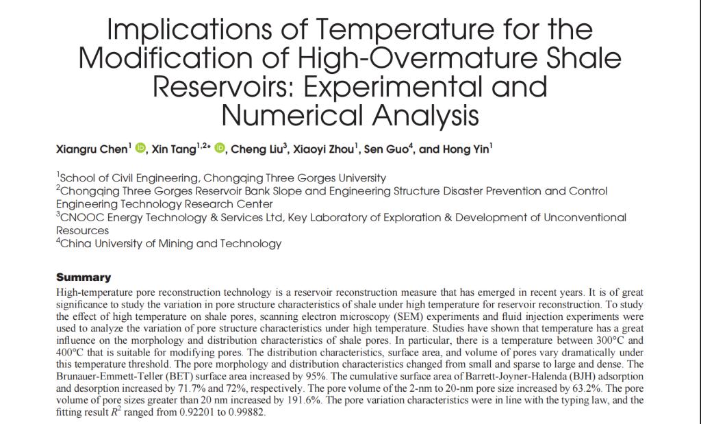 近日,beat365资源与能源高效开发利用工作室在国际知名期刊暨能源资源领域主流期刊《SPE JOURNAL》发表题为“Implications of Temperature for the Modification of High-Overmature Shale Reservoirs: Experimental and Numerical Analysis”的研究论文。唐鑫副教授为论文的第二作者及通讯作者,2022级硕士研究生陈相如为第一作者,课题组教师周小艺、尹鸿等人为共同作者,beat365体育官网为论文完成单位和通讯单位。