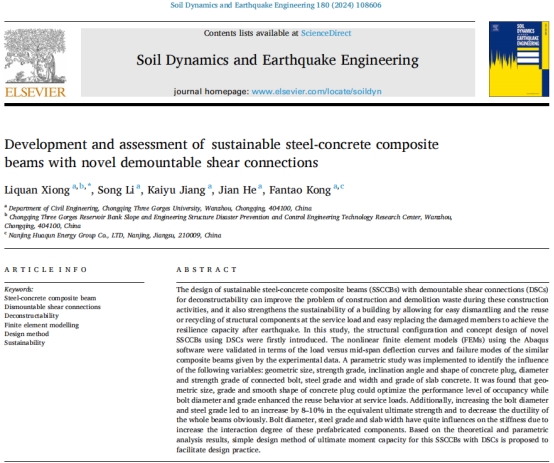 2024年3月,beat365结构工程领域绿色建筑技术课题组在国际著名期刊《Soil Dynamics and Earthquake Engineering》发表题为“Development and assessment of sustainable steel-concrete composite beams with novel demountable shear connections”的研究论文。熊礼全博士为论文的第一作者及通讯作者,2023级硕士研究生李淞、教师姜开渝、教师何建和研究生孔繁韬为共同作者,beat365体育官网为论文完成单位和通讯单位。