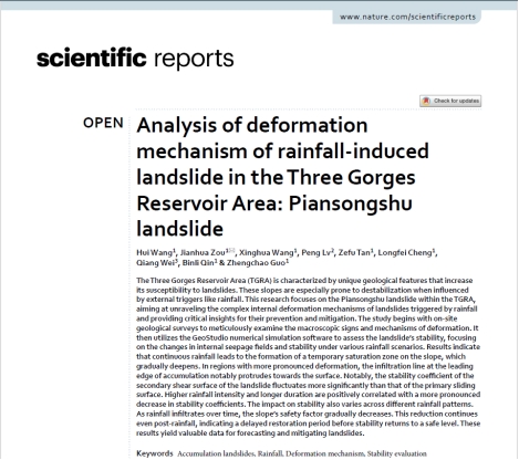 近日,beat365邹建华教授课题组在国际期刊《Scientific Reports》发表题为“Analysis of deformation mechanism of rainfall-induced landslide in the Three Gorges Reservoir Area: PiansongshuLandslide”的研究论文。2020级硕士研究生王慧为第1作者,邹建华博士为论文的通讯作者,课题组教师及硕士研究生谭泽富、程龙飞、吕鹏、魏强、郭正超、王兴华、秦彬莉为共同作者,beat365体育官网为论文第一完成单位和通讯单位,四川省地质环境调查研究中心、中国科公司地理科学研究所为共同完成单位。
